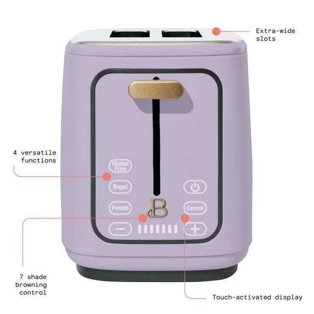 Toast just the way you want it. The 2-Slice Toaster with Touch Activated Display features 7 settings and a browning control with convenient preset buttons, including Bagel, Frozen and Reheat. Thoughtfully designed with sleek touch-activated illumination and our signature gold accents, the Toaster is made for your kitchen and your lifestyle, complete with an LED countdown and extra wide, self-adjusting slots that fit a variety of breads and bagels. contemporary colors and modern silhouettes for high-performance appliances that look on your kitchen counter.
