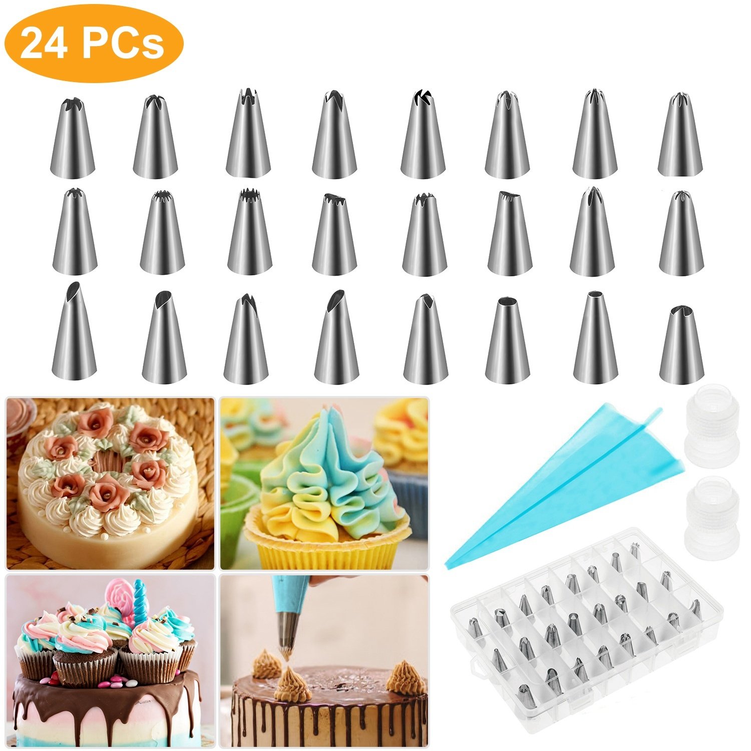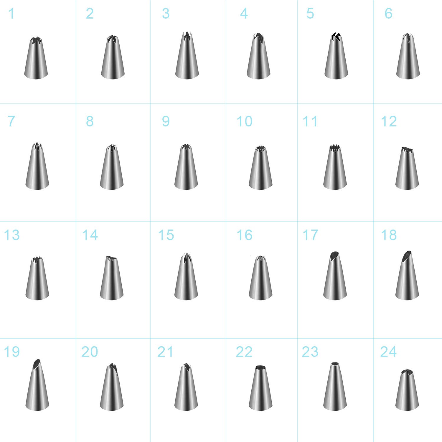 **[Cake Decorating Supplies]*:24 stainless steel tips,2 reusable plastic couplers and one pastry bags,which will help you create a variety of patterns on cake. Each one of 24 decorating pipes has its own number,which helps to find fast all of nozzle style you need.