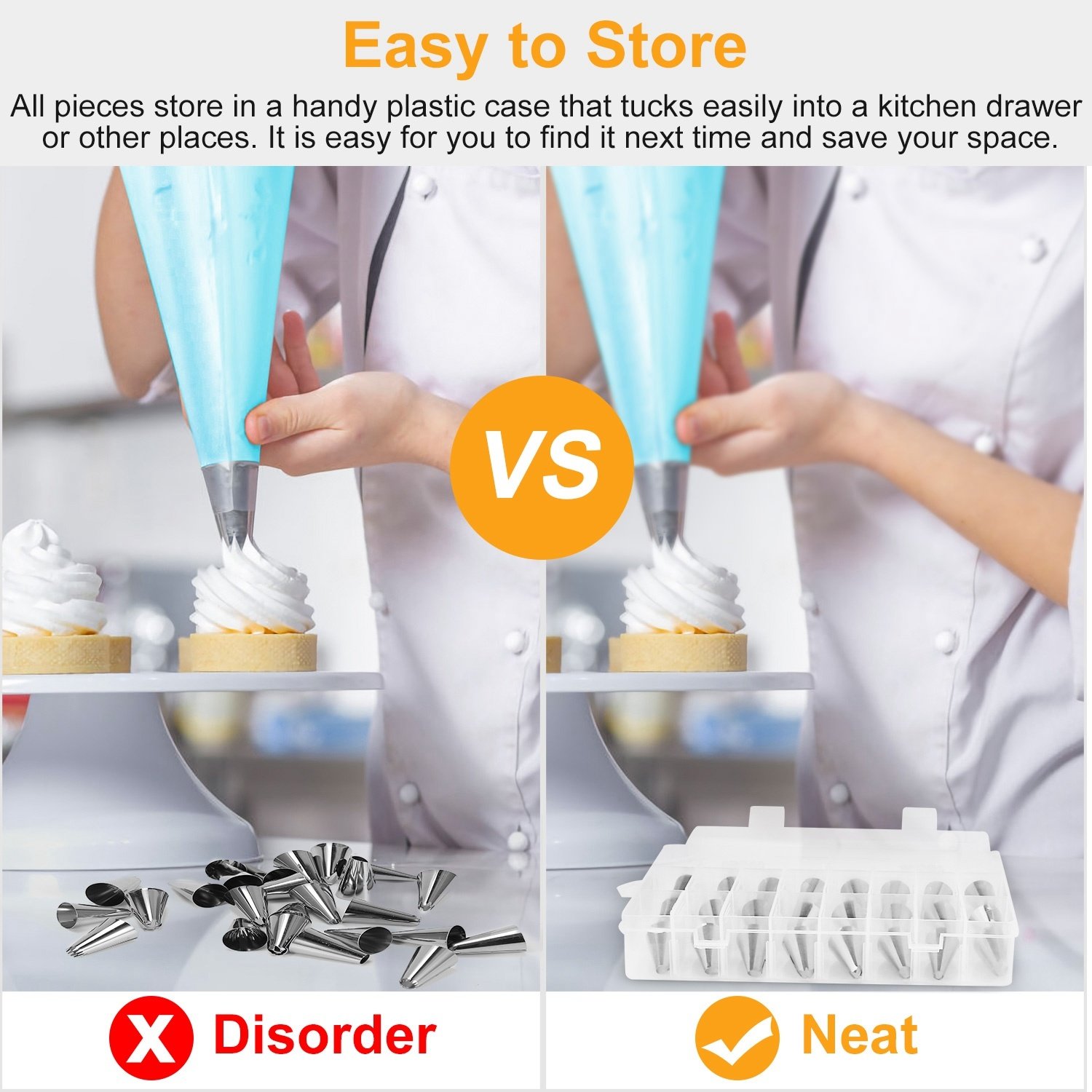 *[Easy to Clean & Store]*:One thin tip brush can make quick work of removing icing from the crevices of the tips and other decorating tools. All pieces store in a handy plastic case that tucks easily into a kitchen drawer or other places. It is easy for you to find it next time and save your space.