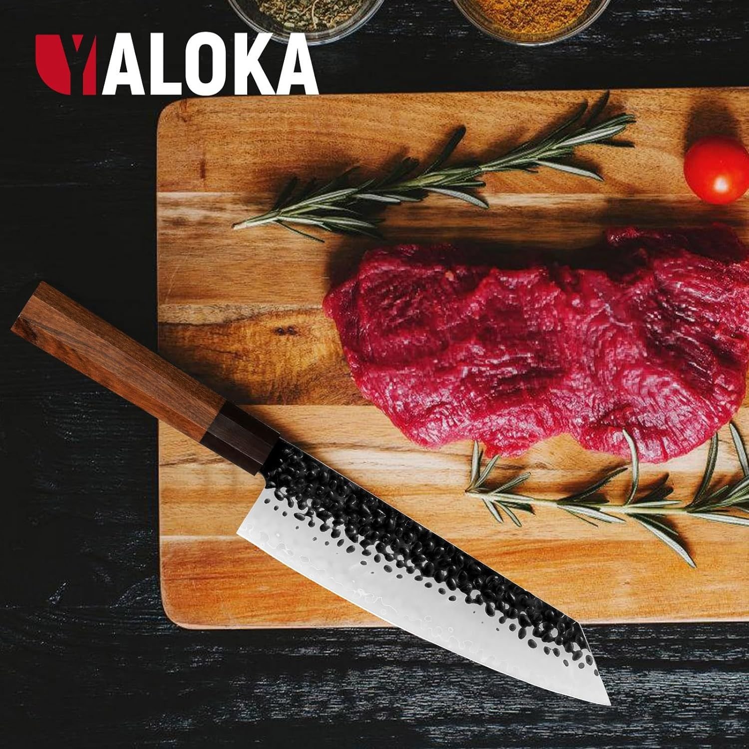 [A Breathtaking Blade]This professional kitchen masterpiece is made of three layers of 9CR18MOV high carbon steel, forged and manufactured using modern technology and traditional craftsmanship, the blade is vacuum high temperature and colddeep treated to ensure flexibility and maximum edge retention, Anti-rust and anti-corrosion capabilities. With a Rockwell hardness of 60 or higher, the edges will not warp or crack.[Comfortable Touch]The classic Japanese handle is made of rosewood. The octagonal handle of high-quality solid wood is stable and safe in humid environments, will not crack over time, and feels comfortable to the touch. The blade is forged in one piece for excellent balance and flexibility. The handle is lightweight and puts weight toward the blade for precise, controlled cuts.[Super Sharp Japanese Knife]The Yaloka 8-inch Japanese Gyuto Knife is an ideal multi-purpose knife suitable for most daily kitchen tasks. It's lightweight, flexible and easy to handle, making it easy to cut, chop, dice or slice with this Japanese knife. The hammer pattern design on the blade makes cutting food less likely to stick, making it ideal for meat, fish, vegetables and fruits. Do not use dishwasher clean knives or use them to cut frozen products, regular cleaning and honing is recommended.[Perfect Cooking Cookware Gift]This well-made kitchen knife makes a great gift for family and friends, for a professional chef or for a lovely person who loves cooking. This durable and beautiful professional kitchen knife and its amazing quality means you will be giving them a very meaningful gift that they will always remember you when cooking with it.[Yaloka Promise]Inspired by ancient Japanese traditions and modern advanced machines, Yaloka knives are handcrafted by highly skilled craftsmen to produce blades of unparalleled quality, beauty and sharpness. It comes with a beautiful gift box and sheath, making it the best choice for gift giving.Please feel free to contact us if you meet any problems.Cannot be sold on Amazon!