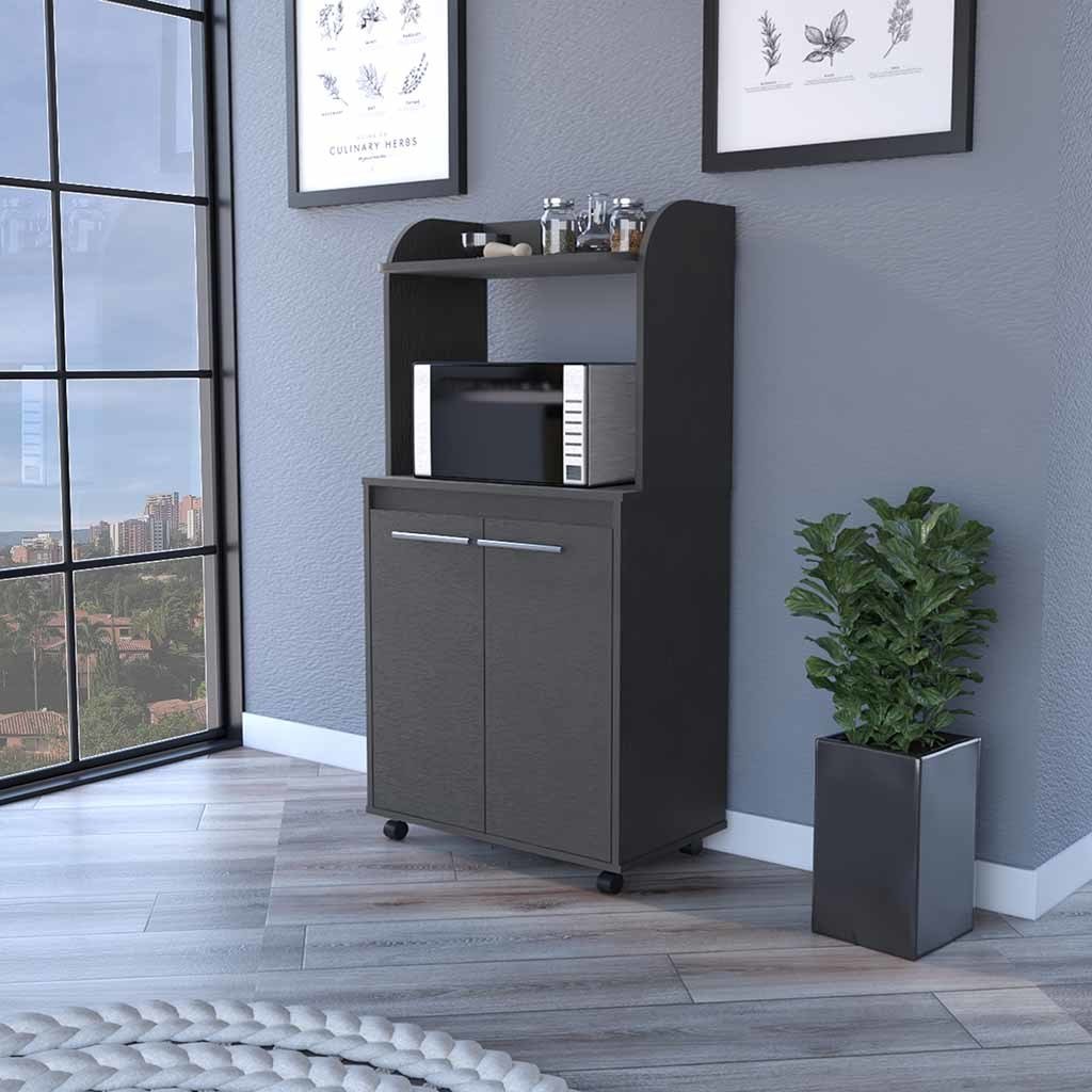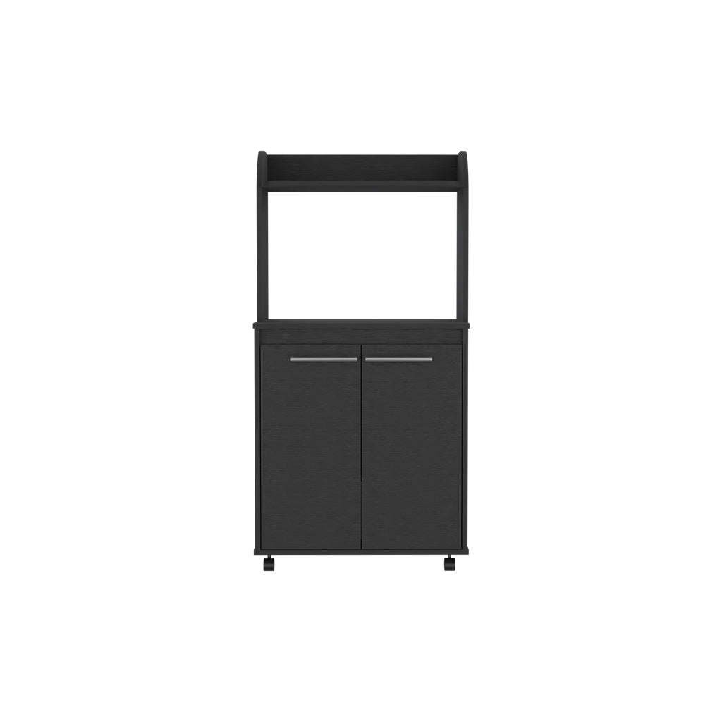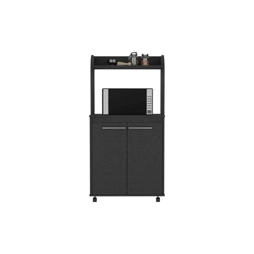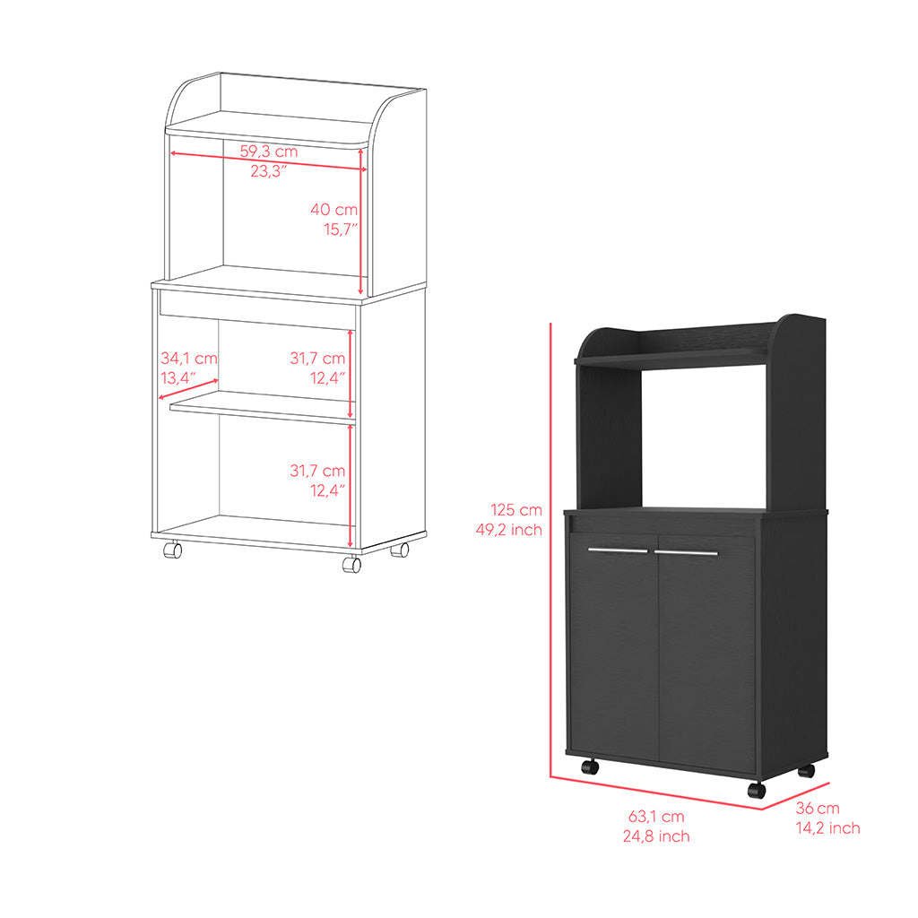 Totti Kitchen Cart is perfect for anyone who wants to add a little more convenience and mobility to their kitchen. With four caster wheels (1,77''), this cart can be easily moved around the kitchen, and the shelf designed specifically for your microwave (15,70''H X 23,34''W) means that you'll never have to worry about where to put it again. Includes a two-door cabinet with two internal shelves (11,49''W X 10,51''H), as well as a large countertop. Designed with elegant Black manufactured wood finish.Dimensions:Height: 49,23"Width: 24,84'Depth: 14,19'Furniture Type: Ready to assemble (full assembly required).Certifications: CARB phase II compliant – TSCA Title VI Compliant.Warranty: 1-year warranty coverage in wooden parts- 1-year warranty coverage in hardware pieces since its manufacturing date is found in the lot number printed in the product box.Shipment details: Free shipping to the 48 contiguous states - delivery time: Between 2 and 5 days depending on the customer's location, season, and weather factors. Other details: This product does not include decorative or background elements; Check that the box is in good condition, and well packed, and check with the help of the manual that the corresponding parts have been included; For more information regarding warranty, shipment details, cancellations, returns & replacement parts go to the bottom section of our website to learn more; Installation & Assembly Instructions included.
