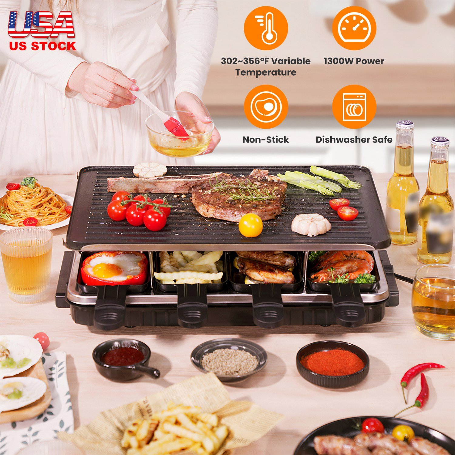 1300W Raclette Desktop Grill for 8People Non-Stick Reversible Electric Indoor Griddle with 8 Cheese Melt Pans Adjustable Temperature Dishwasher Safe K