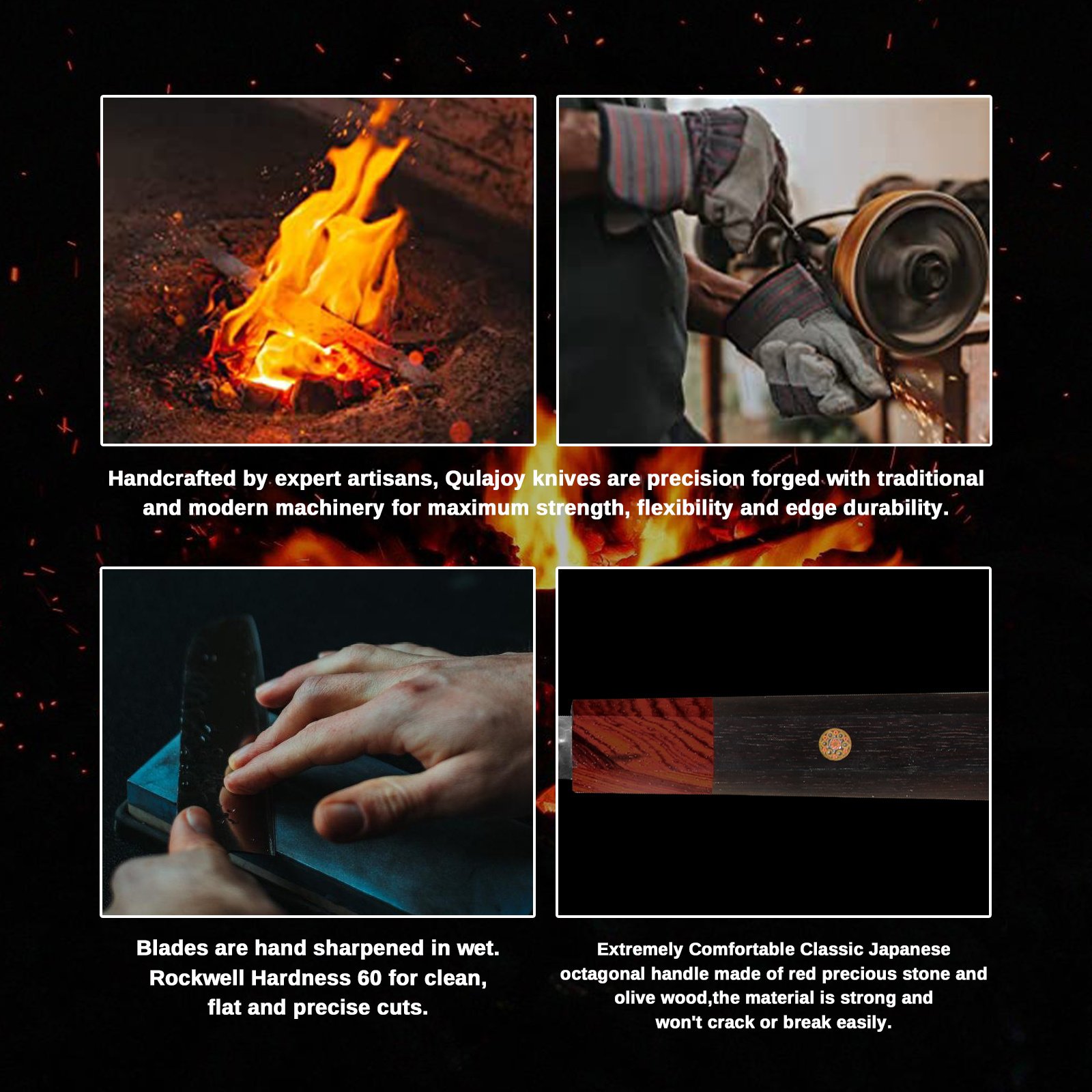 HAMMERED BLADE: Qulajoy 8 inch chef knife is a lightweight, sharp, all-purpose powerhouse. The blades are hand-hammered to minimize food sticking. This blade is used for chopping, slicing, dicing or peeling, and can cut fish, meat, vegetables and more. It is a must-have multi-purpose knife in the kitchen. It is easy to use and can handle various delicacies in the daily kitchen.SHARP CHEF KNIFE: Japanese professional chef's knife is made of VG-10 steel core, 67 layers damascus steel, HRC60+, with excellent anti-corrosion and rust-free properties. Professional craftsmen hand-polished each part, and the beveled V-shaped edges on both sides are cut to 8-12° to make the resistance smaller and sharper. To ensure long-lasting blade use, do not wash and cut bones, frozen meat, or other hard materials in the dishwasher.COMFORTABLE HANDLE: The handle is made of high-quality ebony, Japanese octagonal design, comfortable to hold, and has excellent balance and flexibility. The wood is strong and the handle will not split or warp. The widened finger placement on the shoulder provides excellent control and grip without fatigue, even with prolonged use.JAPANESE KNIFE: The Japanese wood handle chef knife is the perfect multi-purpose kitchen knife. Ideal for preparing meats, fruits and vegetables and more, and perfect for dicing, slicing and chopping, its performance combined with great looks will make it stand out in any kitchen!PRECISION CRAFTSMANSHIP: Inspired by ancient Japanese traditions and modern advanced machinery, Qulajoy knives are handcrafted by highly skilled craftsmen to produce blades of unparalleled quality, beauty and sharpness. It comes with a beautiful gift box and sheath, making it the best choice for gift giving.Cannot be sold on Amazon!